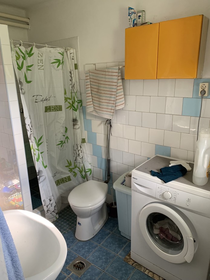A fürdőszoba és a WC egy helyiségben kapott helyet.